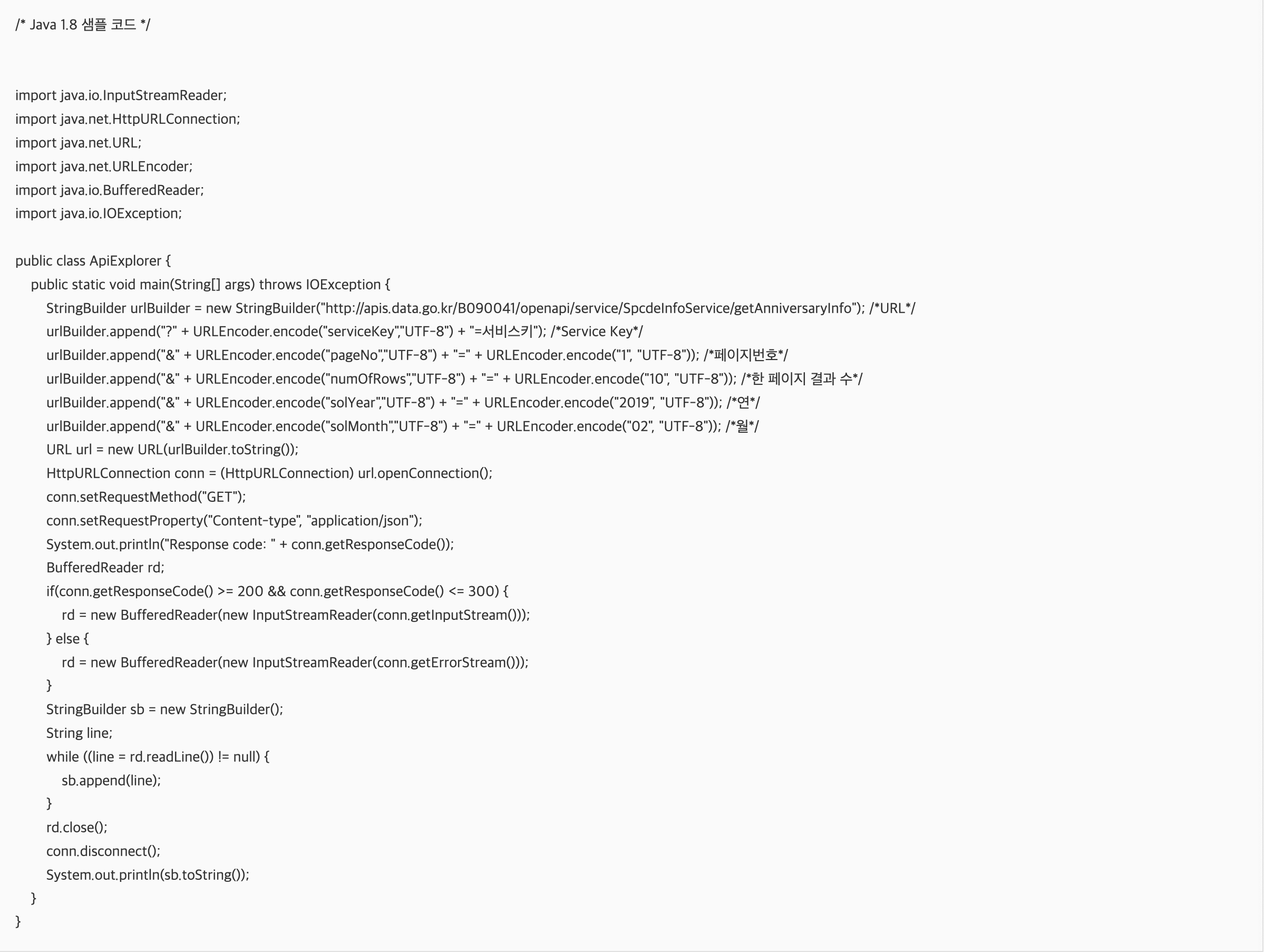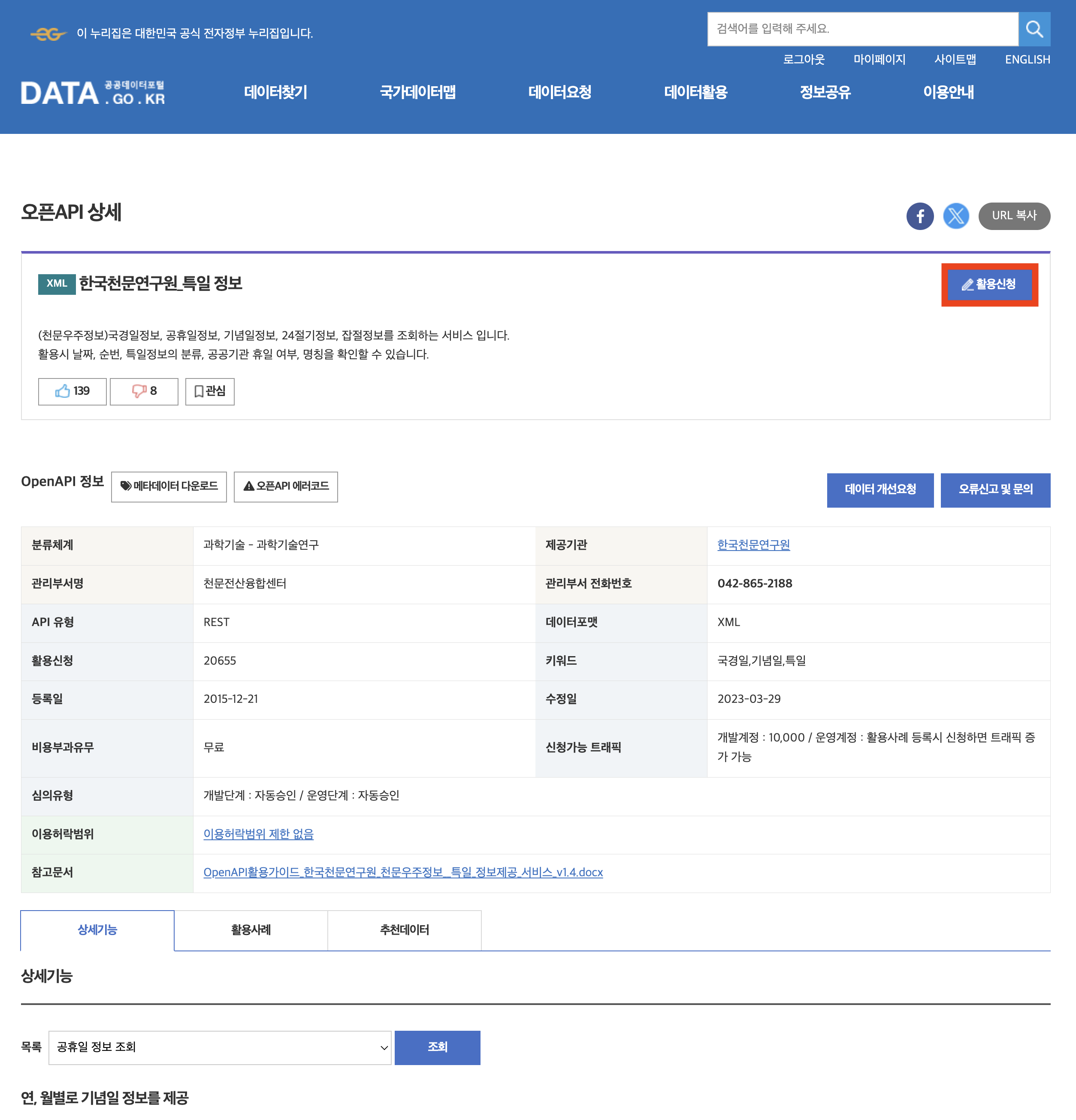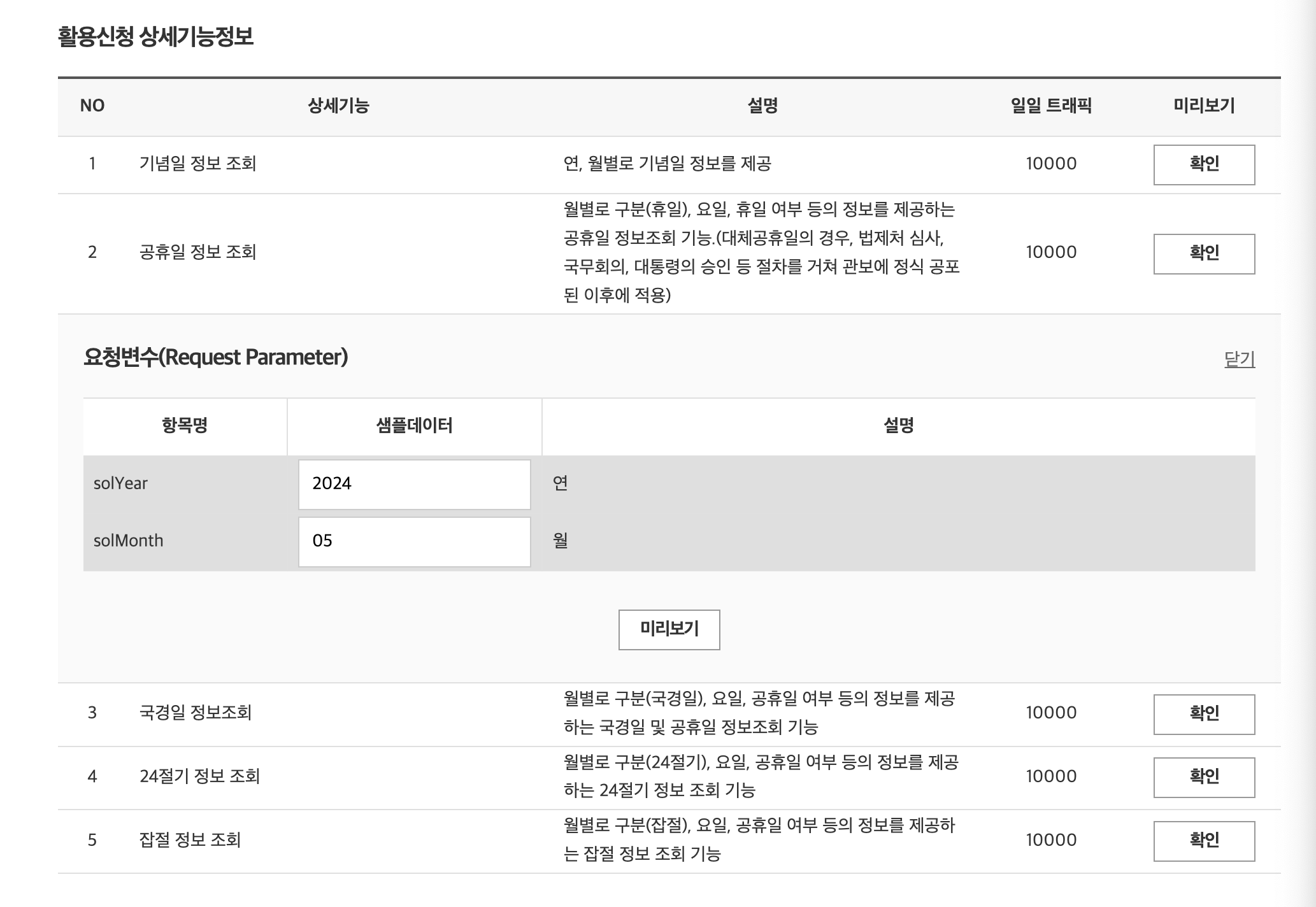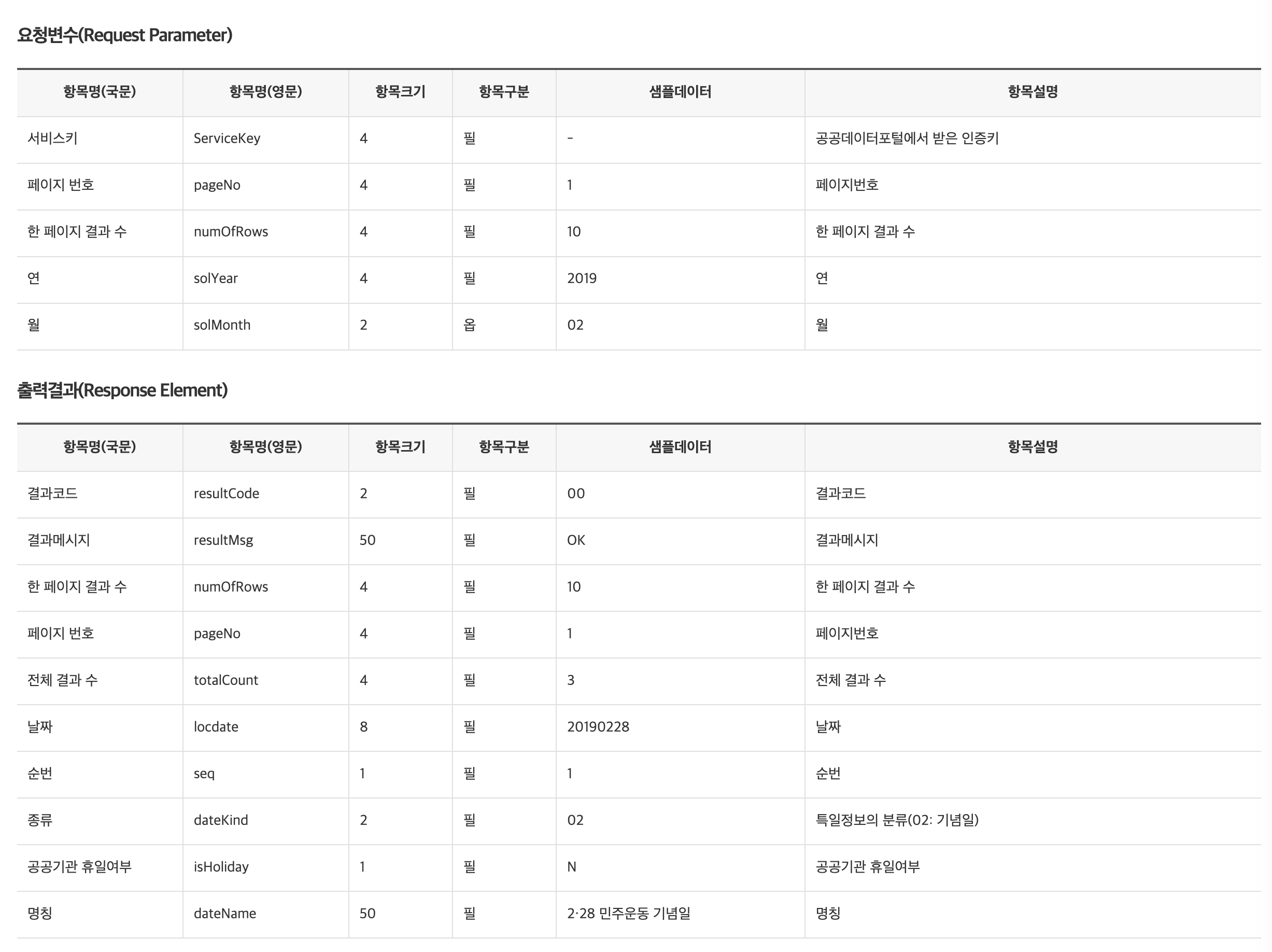 법정 공휴일 수를 구하는 방법은 공공데이터포털의 오픈 api를 사용하여 구할 수 있다. 그 중에서 한국천문연구원 특일 정보를 통해서 계산할 수 있다.
