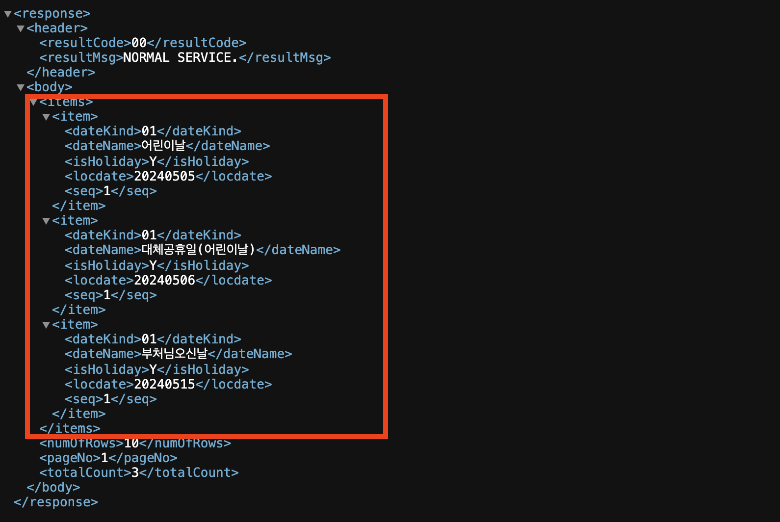 // 이 items의 사이즈가 법정 공휴일의 갯수이다. (혹은 위의 출력 결과의 totalCount를 이용해서 한번에 나타내도 된다.)