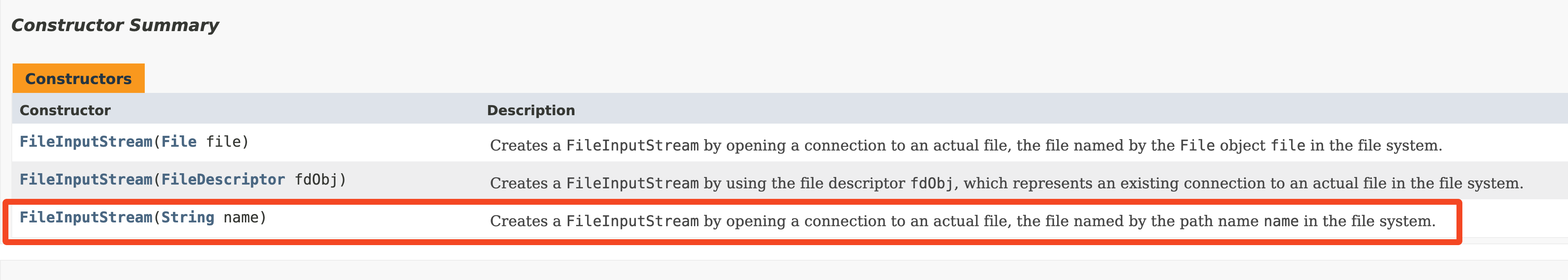 File에 관련된거니까 FileInputStream, FileOutputStream 을 쓰면 될거라고 예상할 수 있다. FileInputStream 의 Javadoc을 보면 생성자의 인자로 무엇을 요구하는지 알 수 있다.
