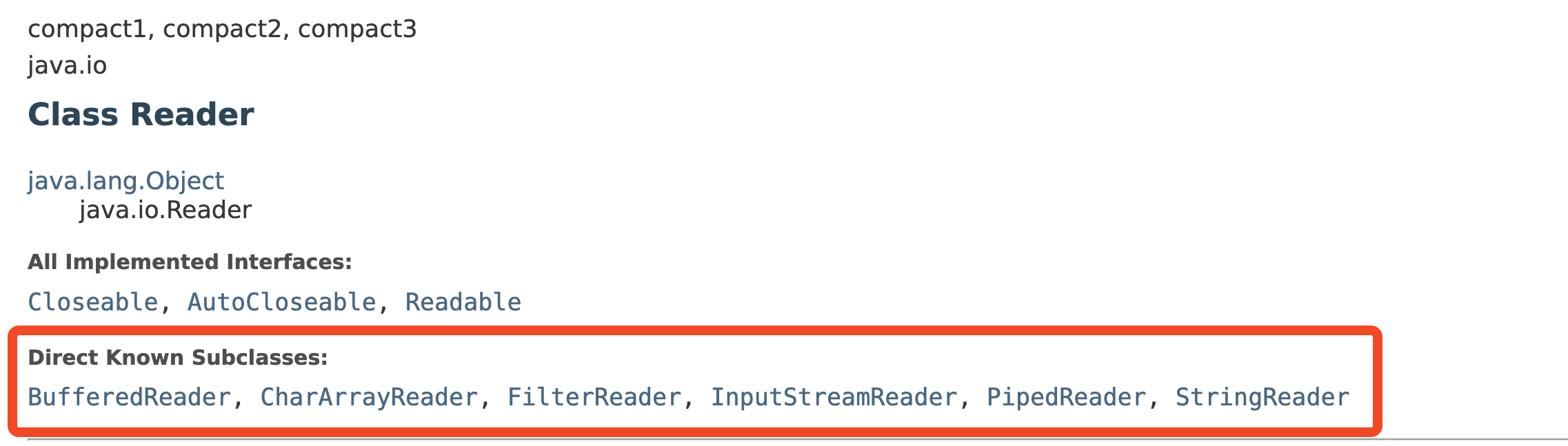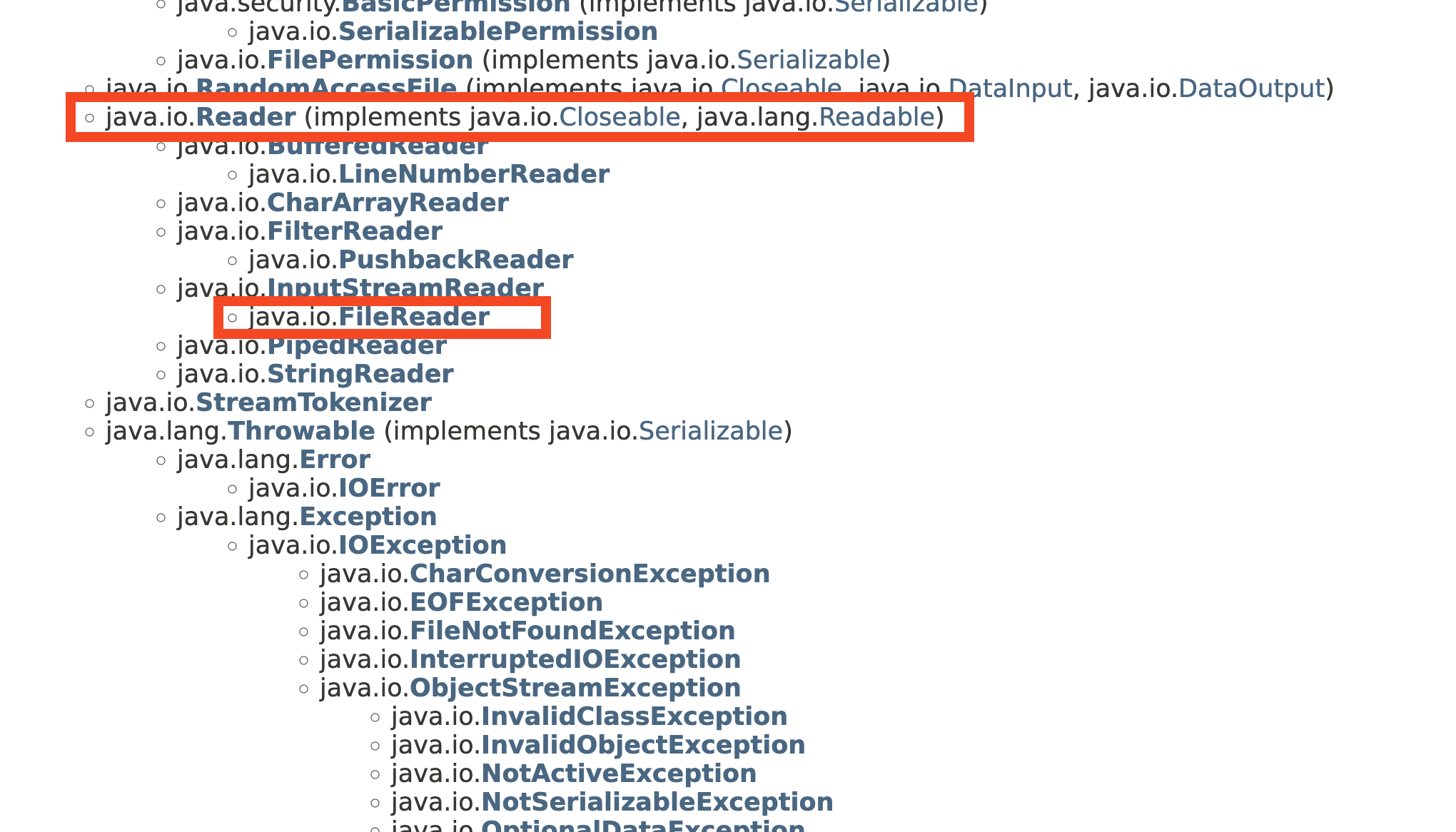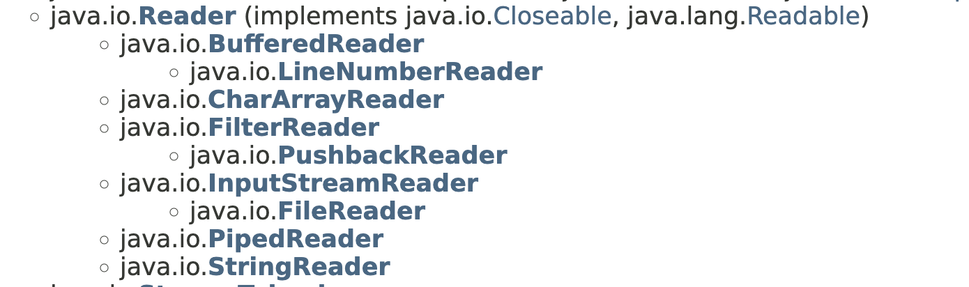 이렇게 FileReader가 Reader의 subclass인 InputStreamReader의 subclass로 존재한다는 걸 알 수 있다. 이렇게 바로 유추해서 찾을 수 있게 하는 것이 상속의 장점 중에 하나다. FileReader라고 작명을 하니 파일에 관련된 클래스를 직관적으로 찾을 수 있다.