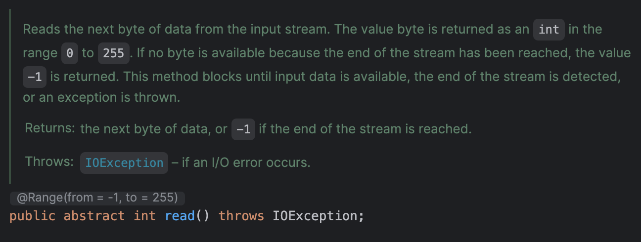 읽고 쓰는 기본적인 행위는 모두 공통으로 처리해야 하는 기능이다. InputStream.java 를 확인해보면 다음과 같은 abstract method를 확인할 수 있다.