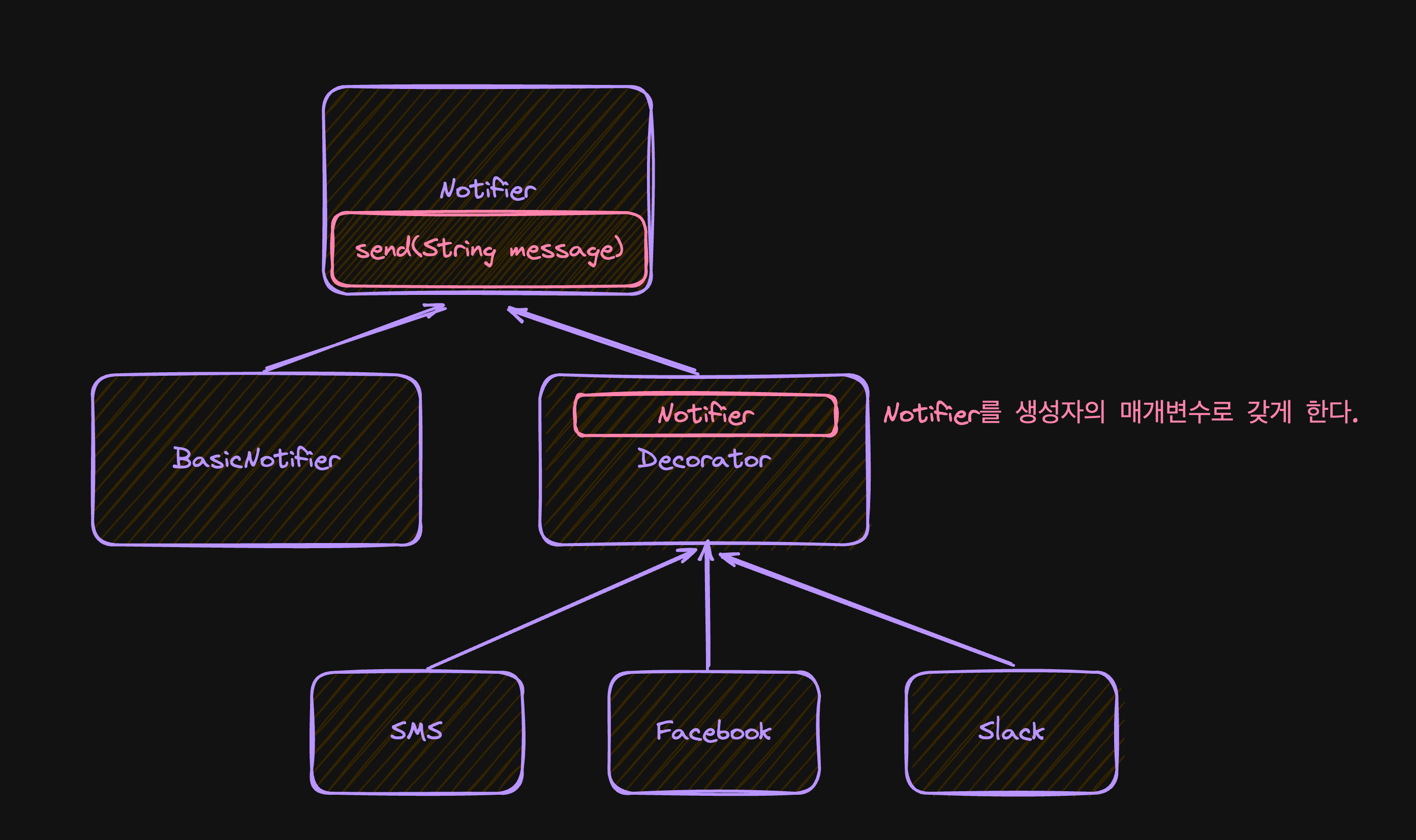 notifier.send(message); // Decorator 의 인자로 들어오는 애가 send 기능을 하게끔 해준다.