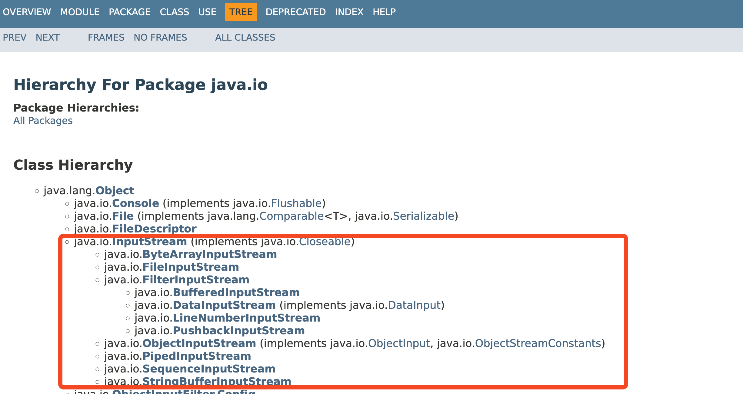 그리고 InputStream 의 subclass 들의 실제 구현은 그 subclass에 해당하는 데이터 소스에 맞춰서 구현을 하기 위해 이렇게 설계했다. InputStream 의 계층도를 보면 다음과 같다.