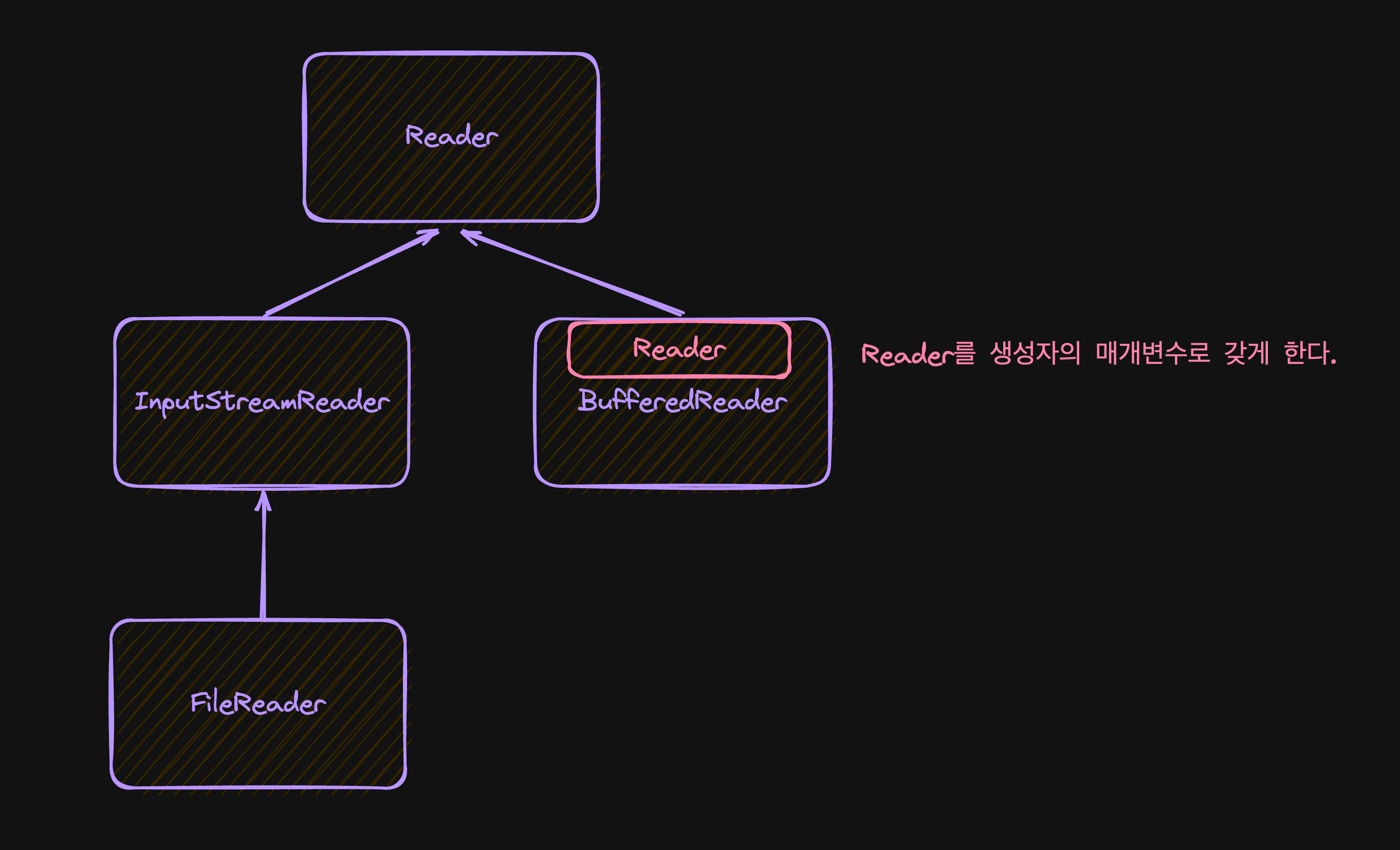 즉, BufferedReader 안에 또 다른 Reader의 subclass를 넣을 수 있게 해준다. 그렇다면 위의 두가지를 결합하면 결국 원하는 로직을 만들어 낼 수 있다는 것이다. 왜냐하면 FileReader는 Reader의 subclass이기 때문이다. 이걸 토대로 로직을 작성하면 다음과 같다.