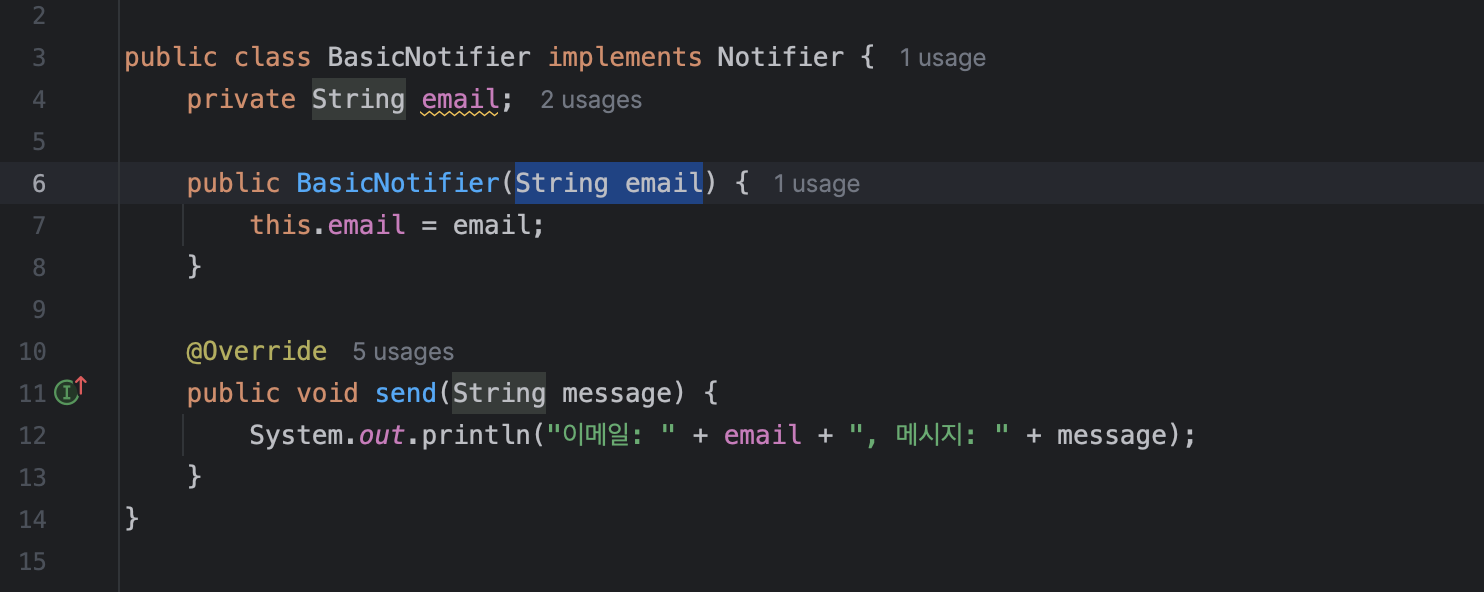 send(String messasge) method를 선언하여 생성자에 주입된 Notifier 타입의 객체가 실제로 send를 하게끔 한다.코드로 나타내면 다음과 같다.