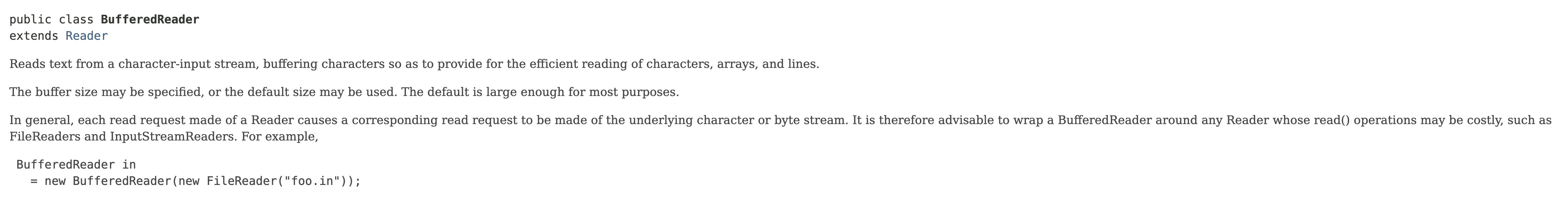먼저, 파일을 읽을 때는 바이트단위에서 문자단위로 읽는데, 이 때 이 과정을 돕는 것이 바로 InputStreamReader 이다. 그렇다면 파일에서 한 줄씩 읽고 쓰려면 어떻게 해야 할까? 한 줄이란건 여러 개의 문자들이 합해진 것을 말한다. 그렇다면 여러 문자들을 동시에 읽고 쓰면된다. 이 기능을 하는 게 Reader의 subclass인 BufferedReader이다. 친절하게 Javadoc에 간단한 예제도 남겨줬다.