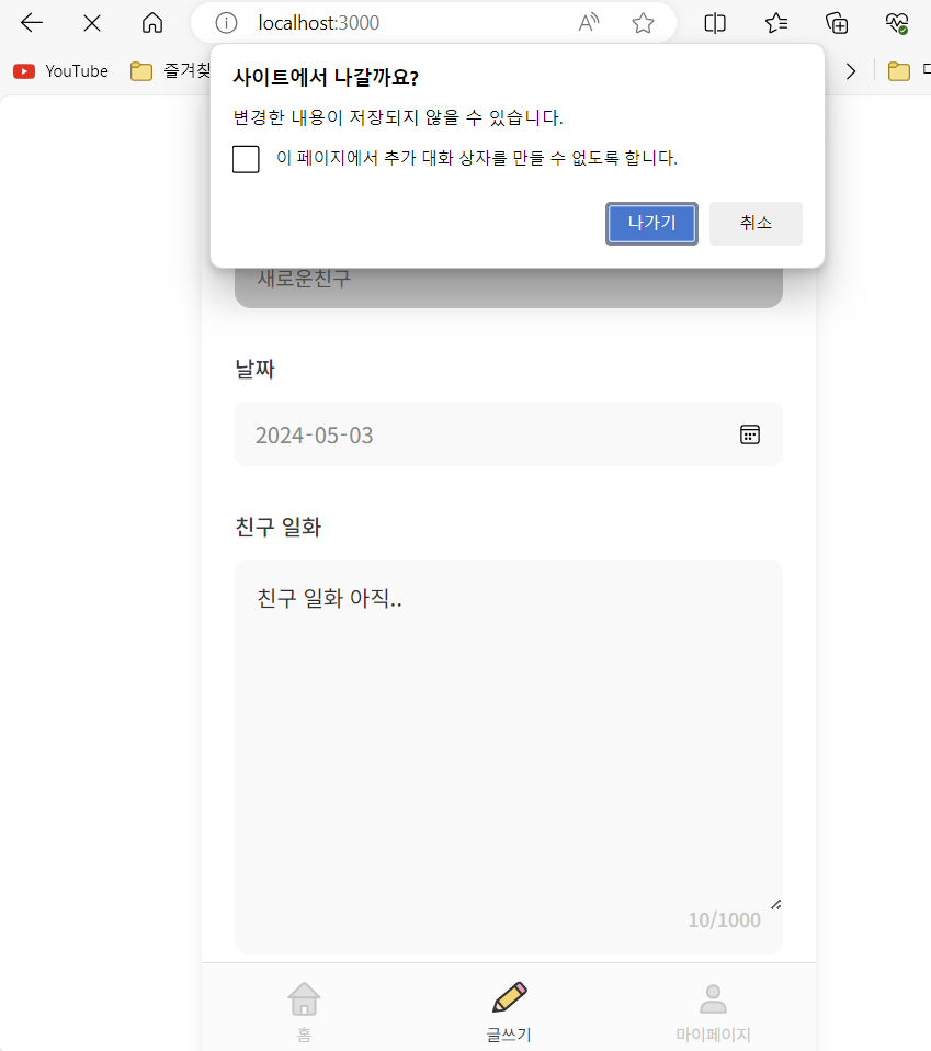 여기서 페이지를 이탈하거나 혹은 새로고침을 할 경우 폼 데이터가 초기화하기에 사용자에게 이탈 전 아래와 같이 alert 창을 띄워주는 hook인 usePreventLeaver 를 추가해주었다.