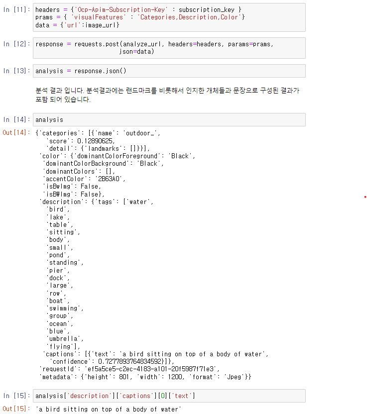 analysis 변수 안에 들어 있는 description 항목 안에 있는 captions의 0번째 항목의 text의 값을 가져온다.