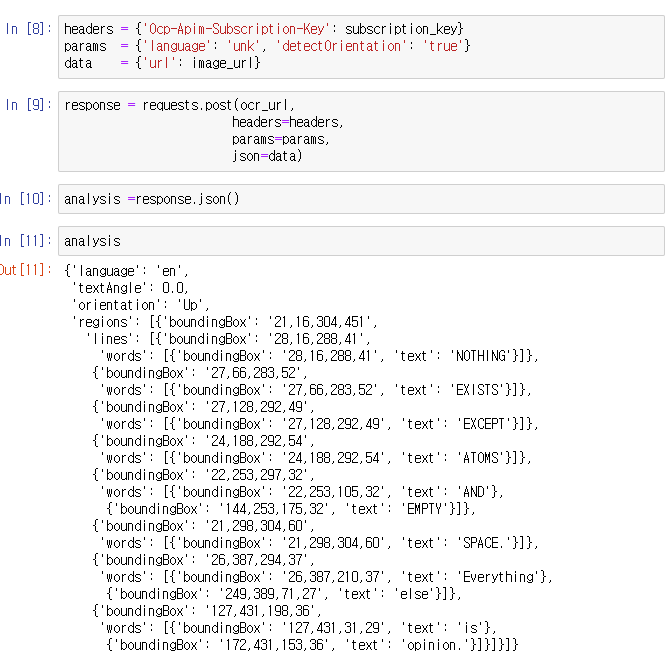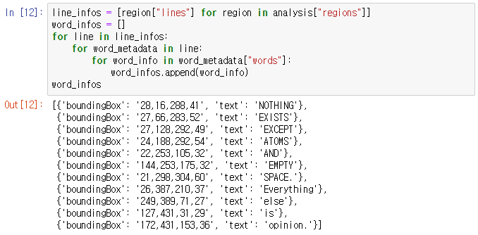'words': [{'boundingBox': '28,16,288,41', 'text': 'NOTHING'}]}, <-- 텍스트 NOTHING의 좌표