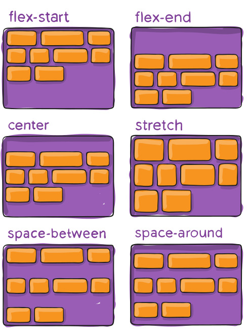 flex-start: 위쪽부터 덩어리 형태로 배치, 여유 공간은 아래쪽에 위치