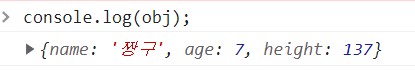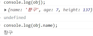이렇게 console.log(객체.변수이름); 출력하고 싶은 변수값을 가지고 있는 변수이름을 입력하면 된다. obj 안에 name이라는 key를 가지고 있는 value를 출력 해달라는 뜻.