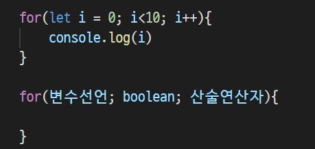 변수 i의 값을 0으로 설정하고, 내가 설정한 변수(0)가 10보다 작은 경우까지만, 산술연산자대로 처리해서 그 안에 있는 for{} 출력문을 내놓겠다는 뜻이다.