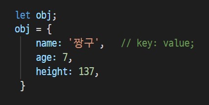 마찬가지로 객체에서도 중괄호 안에 key: value 값을 넣어준다. key는 변수를 가리키는 역할을 한다.