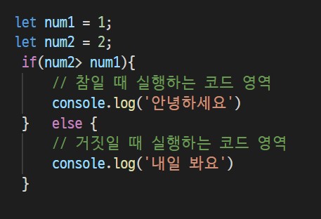 if()안의 값이 참이면 {}안에 있는 출력문을 내놓고 거짓이면 else {} 안에 있는 출력문의 값을 내놓는다.