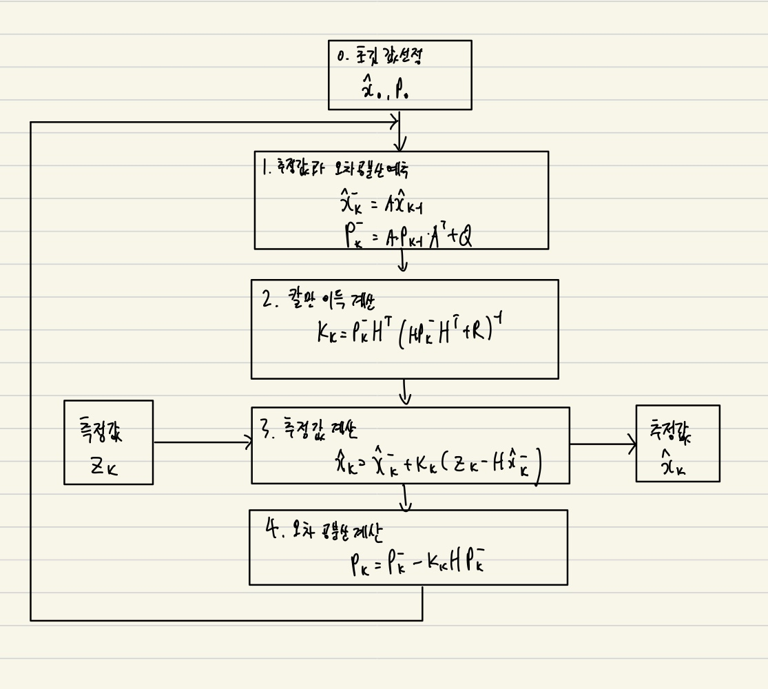 - x^k−인 예측 값에 더해주면서 새 추정값을 얻음 이는 센서와 예측을 섞어