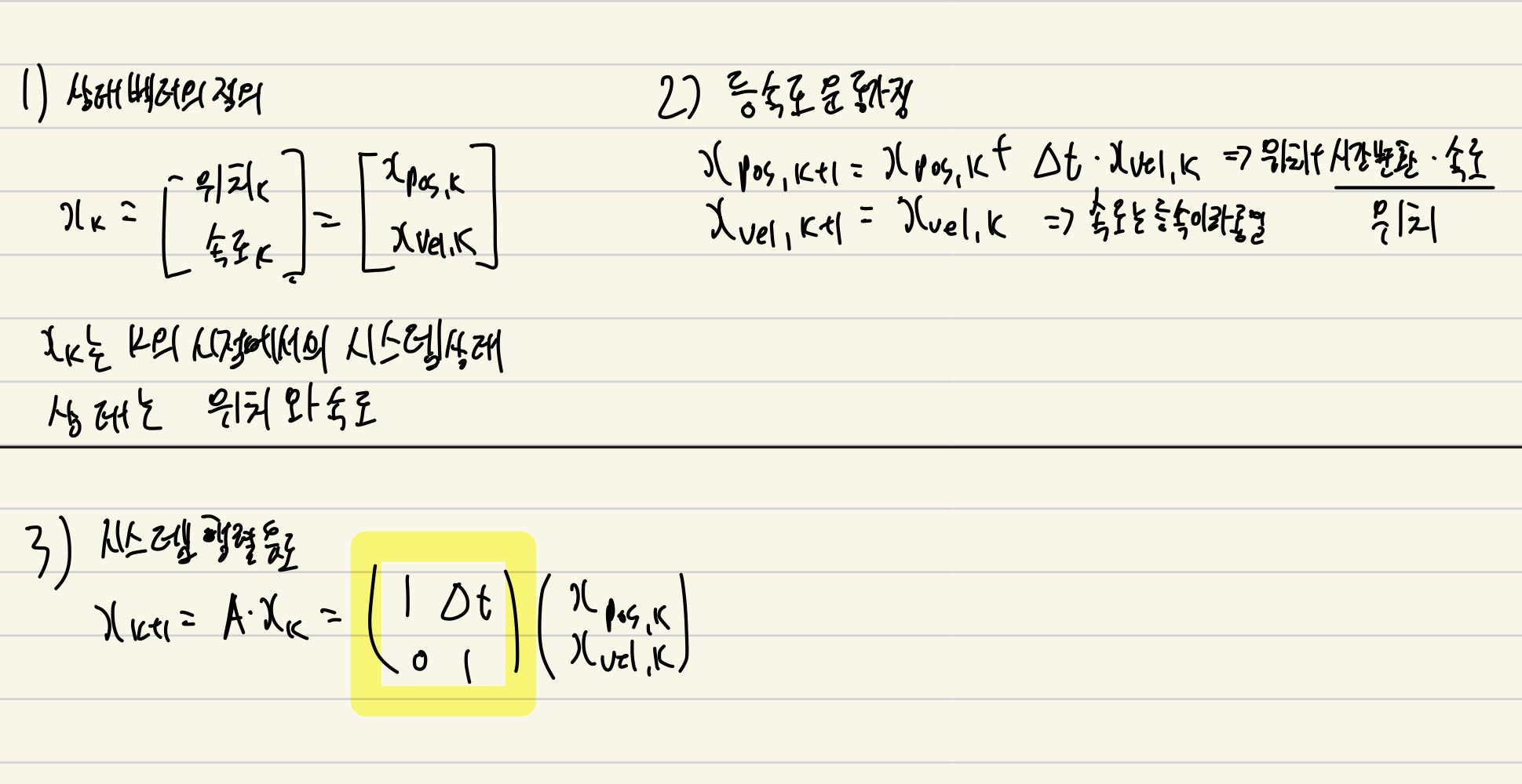 - A : 시스템 모델로 상태 전이행렬 (이전 상태에서 다음 상태로 변환하는 것)