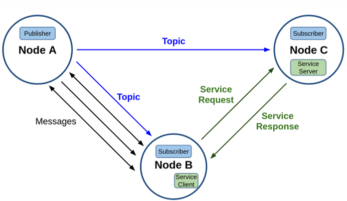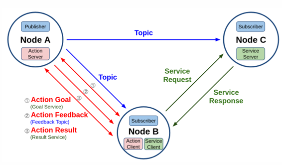 ▪ 양방향 메시지 송수신 방식으로 토픽(topic)과 서비스(service)의 혼합한다.