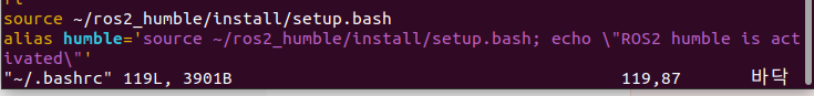 하단에 이렇게 작성을 하면 echo가 print하는 느낌으로 만약 humble을 작성하면 우측것이 실행되며 bash setup이 되면 "ROS2 humble is activated"가 도출되게 된다.