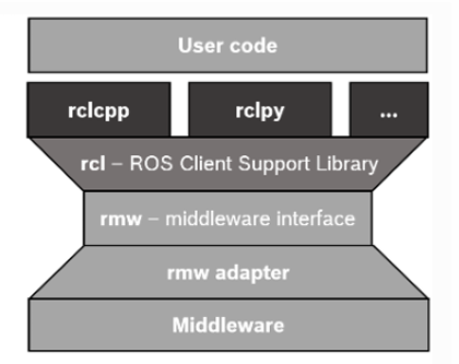 미들웨어 : 분산 네트워크에서 애플리케이션 또는 구성 요소 간에 하나 이상의 종류의 통신 또는 연결을 가능하게 하는 소프트웨어. ROS2에서는 노드 간의 메시지 송수신 및 이벤트 처리를 담당