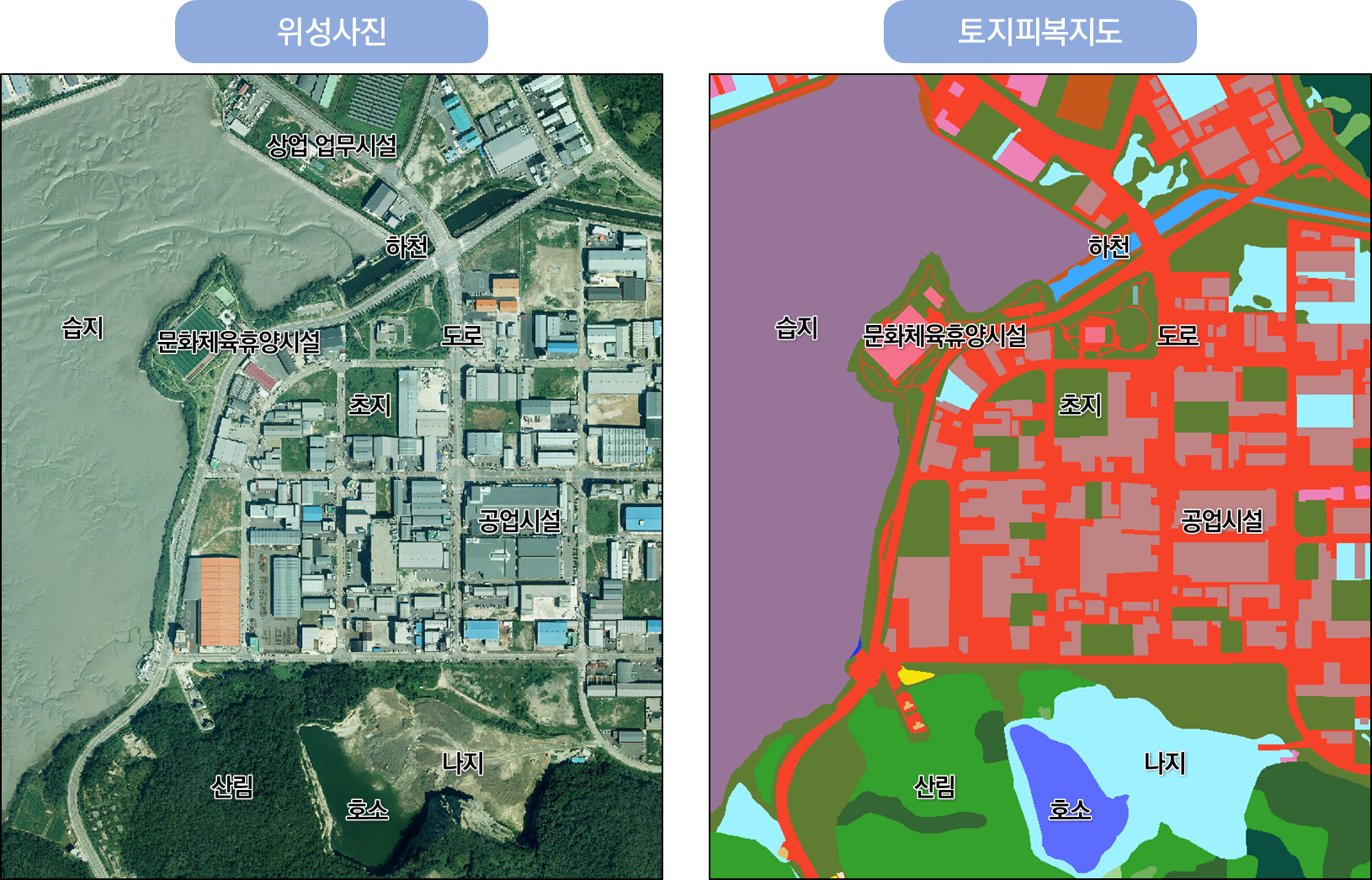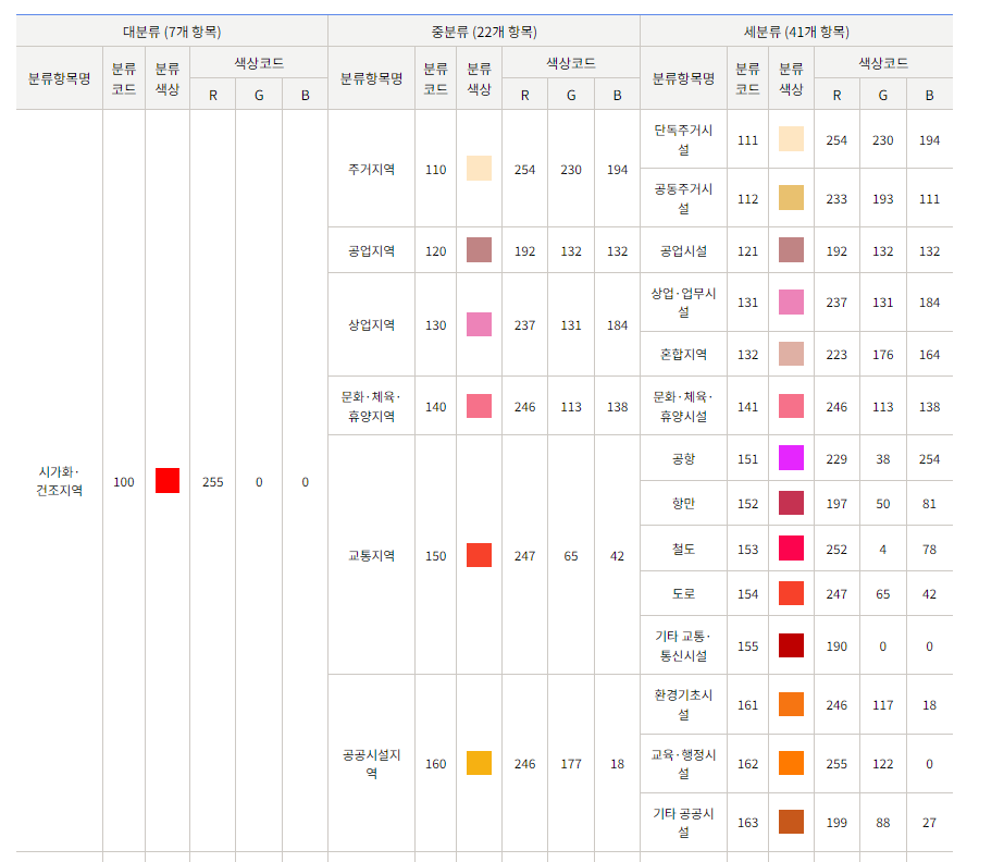 - 토지피복도: 지구표면 지형지물의 형태를 일정한 과학적 기준에 따라 분류하여 동질의 특성을 지닌 구역을 Color Indexing 한 후 지도의 형태로 표현한 공간정보 DB
