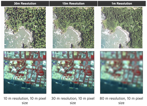- 픽셀의 숫자가 작을 수록 상대적으로 작은 지상의 물체를 판독할 수 있음