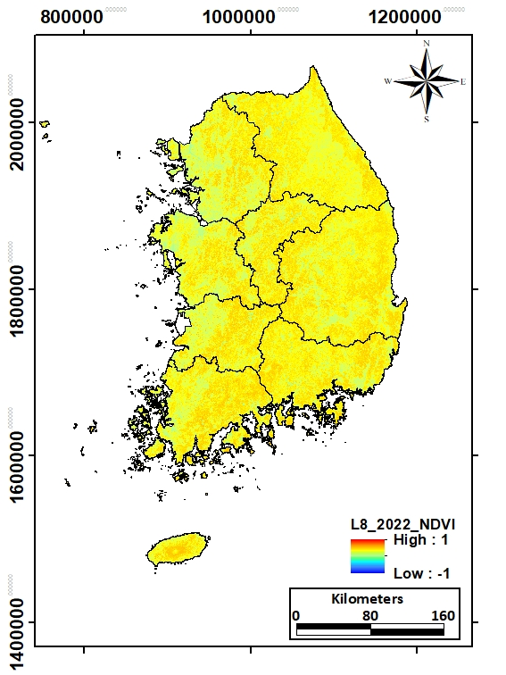 - 토지피복지도는 해상도에 따라 대분류(해상도30M급), 중분류(해상도5M급), 세분류(해상도1M급)