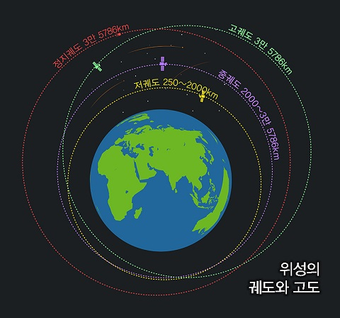 - 정지궤도(3만 6,000km): 최대한 넓은 범위에서, 한 번에 넓은 범위를 관찰해야 하는 경우