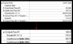 최초 구현 후 파싱 연산으로 인해 프레임 드랍이 일어났습니다. Light Culling Pass에 대한 비용 측정을 위해 RenderDoc의 GPU Timer, CPU 실행 시간을 보기 위한 Timer 측정으로 패스 내의 스테이징 과정이 가장 비용이 많이 듦을 파악할 수 있었습니다.