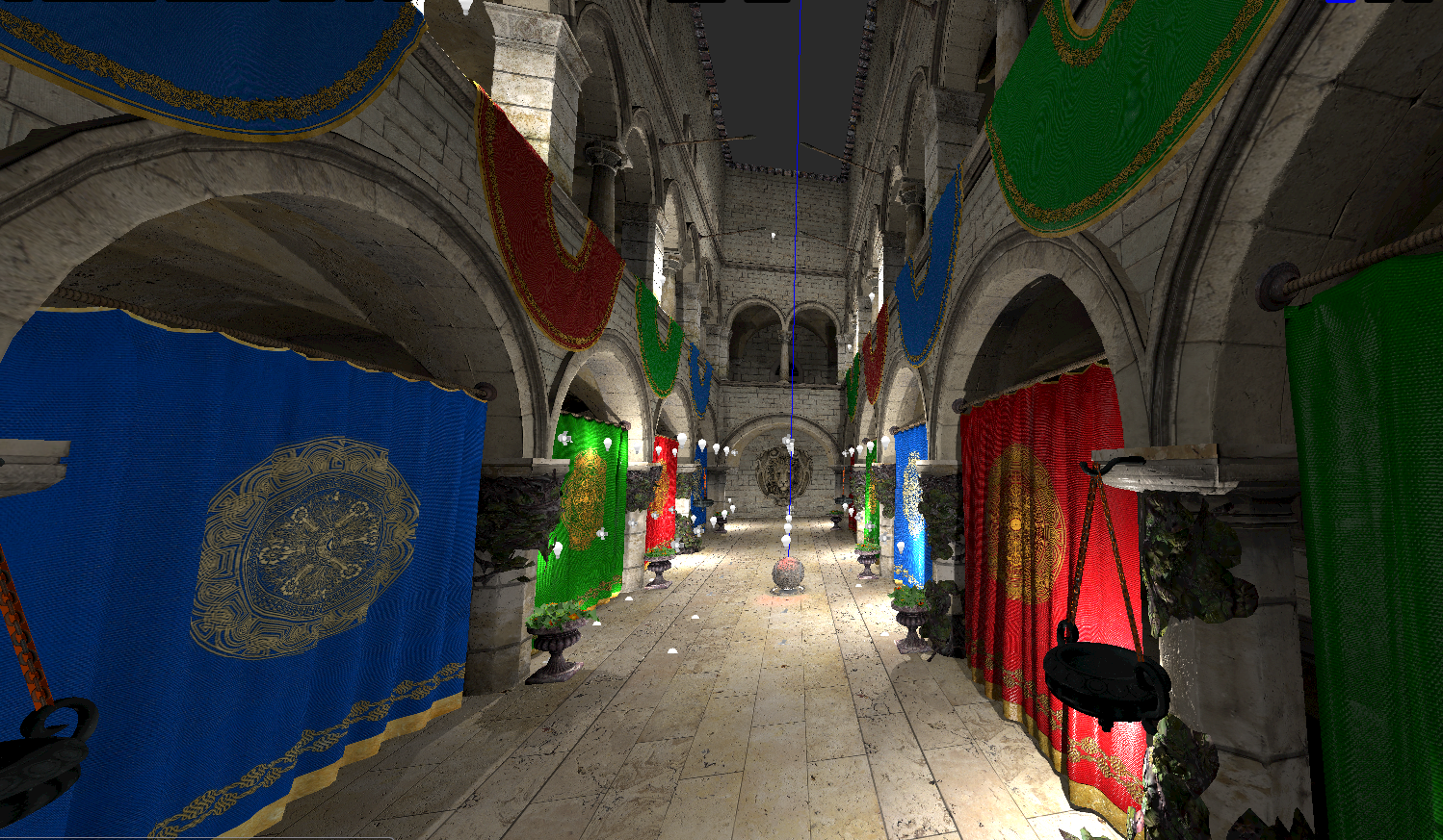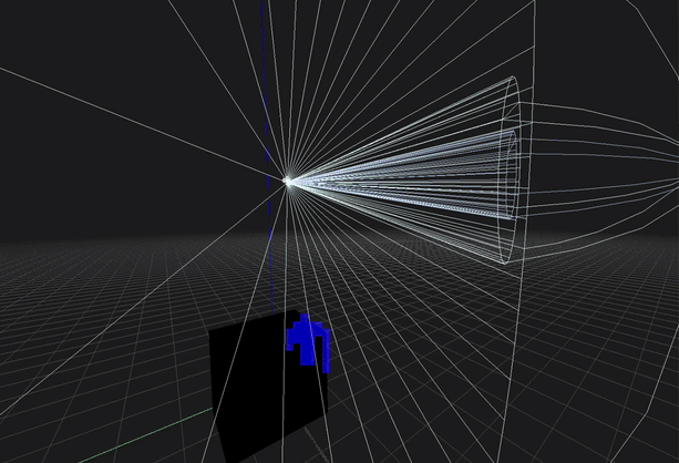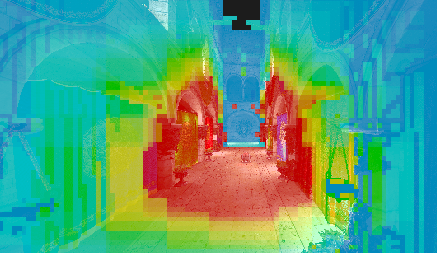 아래는 최종적으로 오브젝트와 조명의 깊이 구간까지 고려한 데모 이미지입니다. 아래 이미지는 오브젝트와 조명과 멀찍이 떨어져 있어 교차횟수가 적게 표기됩니다. (파랑색)