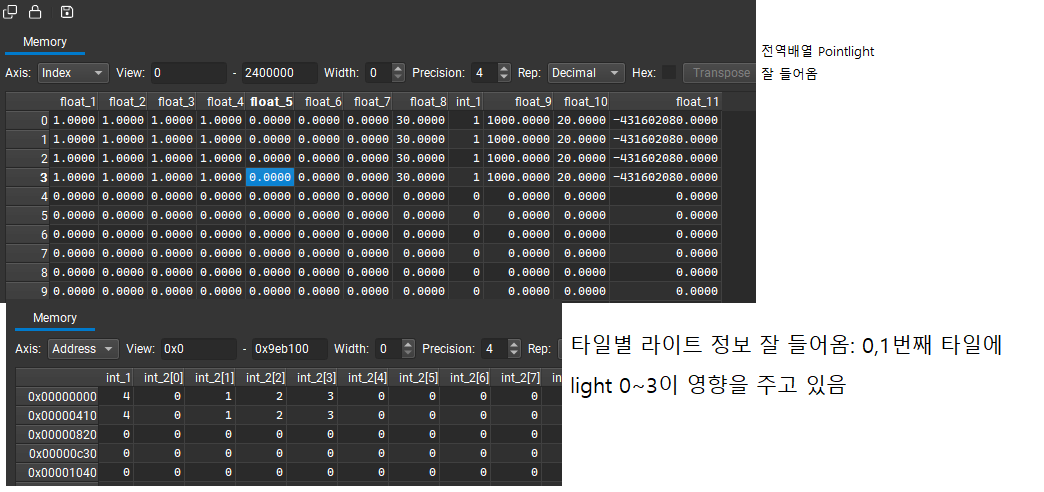 Pixel Shader에 유효한 조명 정보, 타일별 조명 인덱스 목록이 저장되는지 확인. (via NSight)