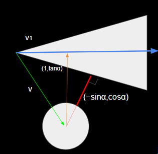 - 원뿔의 측면을 정의하는 벡터 (1, tan(a))를 정의하고 측면의 법선벡터를 단위벡터로 정의한다 (-sina, cosa)