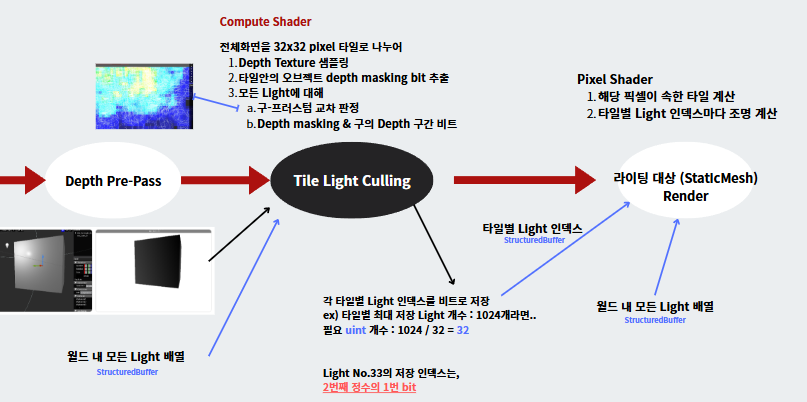 Pixel Shader는 Compute Shader 연산 결과 (타일별 조명 인덱스 목록을 비트로 담은)와 전역 조명 배열을 바인딩 받습니다.