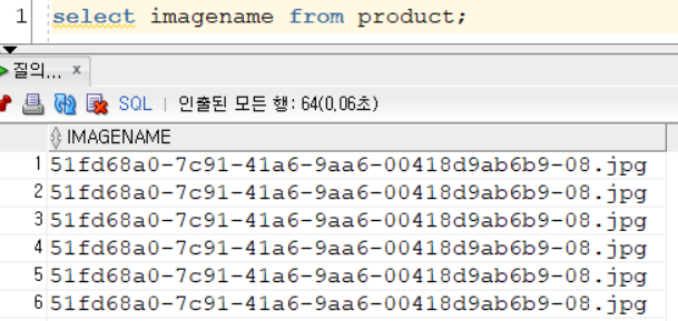 화면 출력에 앞서 imagename을 출력 관련해 수정해 주어야 한다. DB에 저장된 imagename을 보면 아래처럼 우리가 UUID로 만들어 준 문자열만 들어가 있다.