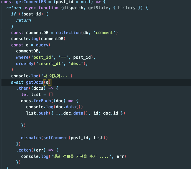 공식 문서 보면서 새 쿼리문 쓰다가 지쳐 그냥 get.then으로 해결...