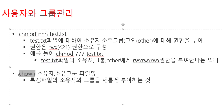 소유자 그룹 : 특정한 사용자 list를 그룹으로 묶어놓은 개념으로 리눅스에서 모든 사용자는 어떤 그룹에 속해있다