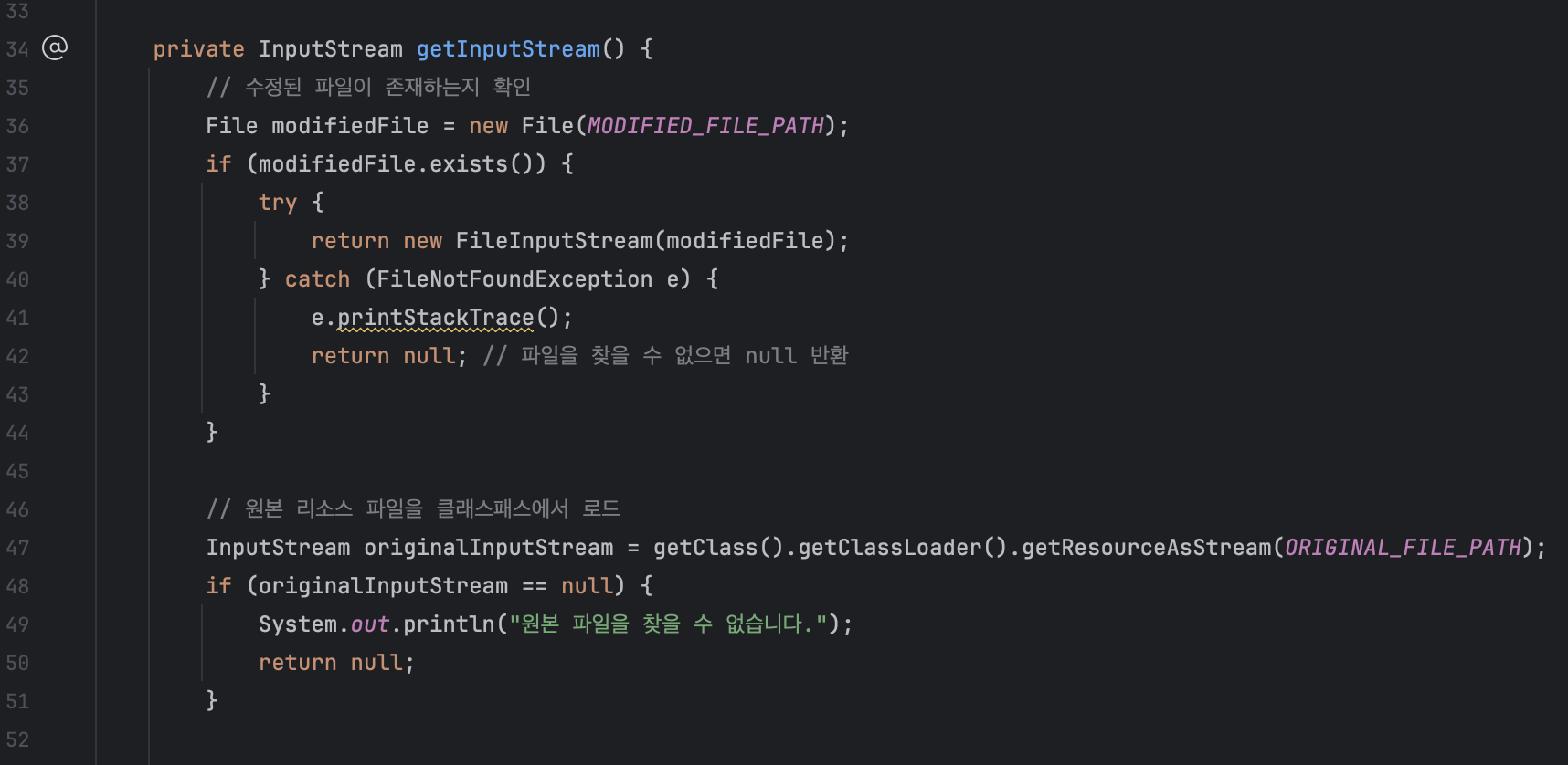 resources 패키지에 파일 추가 및 활용 시 주의 사항resources 디렉토리에 파일을 추가할 때는 경로가 정확한지 확인해야 한다. 예를 들어, 서브 디렉토리에 파일을 저장했다면 getResourceAsStream("subdir/파일명.txt")처럼 경로를 포함해야 한다.resources 폴더는 JAR 파일로 패키징되므로, 리소스 접근 방식은 파일 시스템의 위치와 상관없이 클래스패스에서 로드해야 한다.자, 이렇게 해서 파일을 불러오는 방법을 알아보았다. 이제 이 파일 데이터를 활용하고, 변경 사항이 생기면 저장도 해야겠다. 그런데 콘솔에서는 저장된 것처럼 보이는데, 실제로 .md 파일을 확인해 보면 파일이 변경되지 않네요. 이게 무슨 상황일까? 파일이 변경되지 않은 걸로 보아 캐시에 저장된 값을 불러오는 걸까?