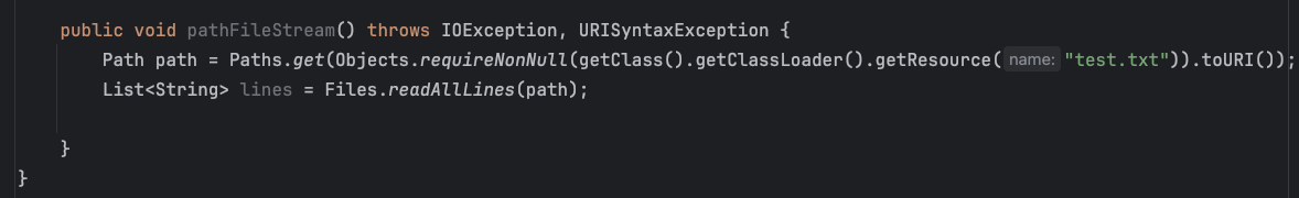 getResourceAsStream 메서드를 사용하여 클래스패스에 있는 파일을 InputStream 형태로 읽어온다. 이 방식으로 리소스 파일을 읽으면 운영체제와 무관하게 파일을 처리할 수 있다.Path와 Files 클래스 활용Path 및 Files 클래스를 이용해 리소스를 읽을 수도 있다. 이 경우 파일을 바이트 또는 문자열로 읽거나 파일 경로를 확인하는 기능을 사용할 수 있다.