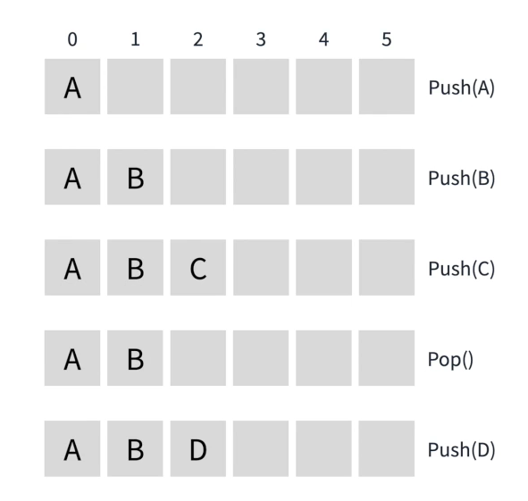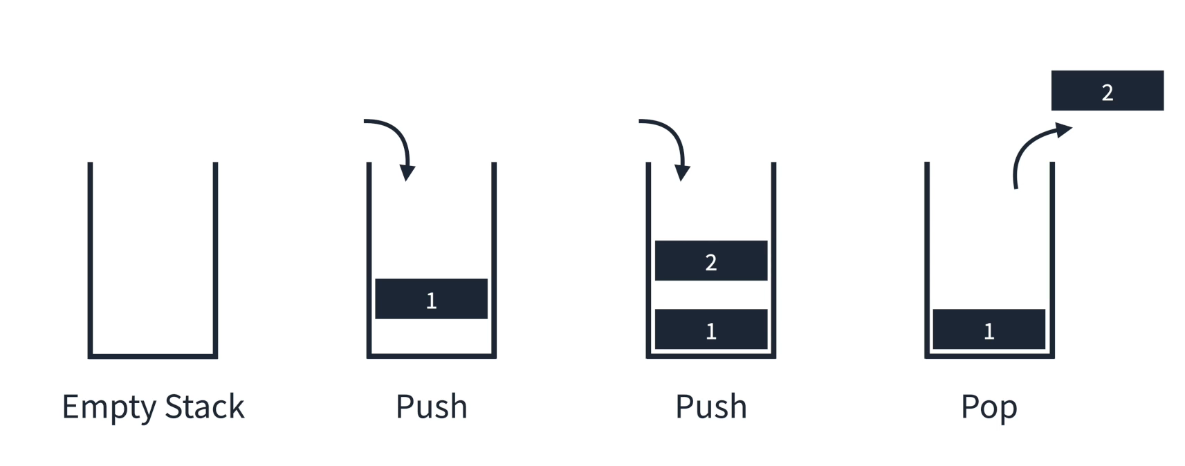 요소를 넣는 행위를 PUSH, 빼는 것을 POP, 맨 위의 요소를 TOP이라고 부른다.