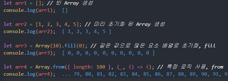 let arr4 = Array.from({ length: 100 }, (_, i) => i); // 특정 로직 사용, from