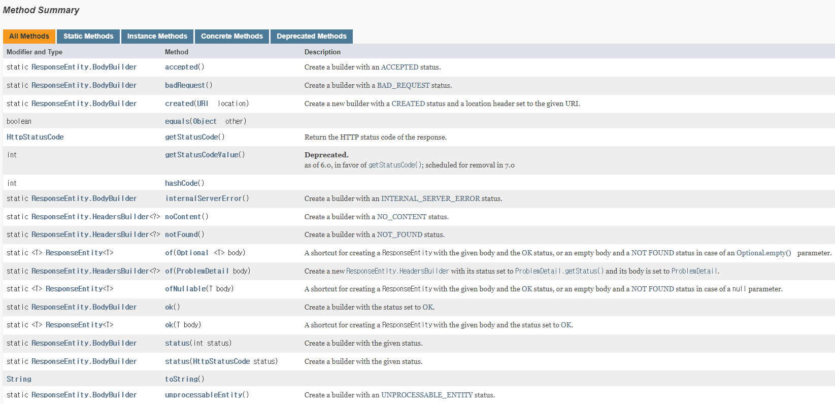 정적 메서드를 이용한 방식의 경우 Spring에서 제공하는 다양한 정적 메서드를 제공하여 쉽게 응답을 생성할 수 있다.