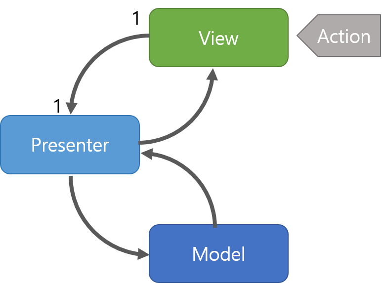 view를 통해 사용자의 입력을 받고 Model에 도움을 받아 사용자의 데이터를 처리하고 결과를 View로 다시 전달. present는 interface를 통해 View와 상호작용.