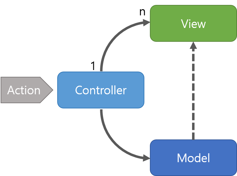 View는 ViewModel에 관한 참조를 가지고 있지만, ViewModel은 View에 관한 정보를 모릅니다. 이는 View와 ViewModel사이의 n:1의 의존관계가 생기며 다수의 View는 하나의 ViewModel에 매핑될 수 있습니다. 이로서 ViewModel은 다수의 View에 대해 완전히 독립적입니다.