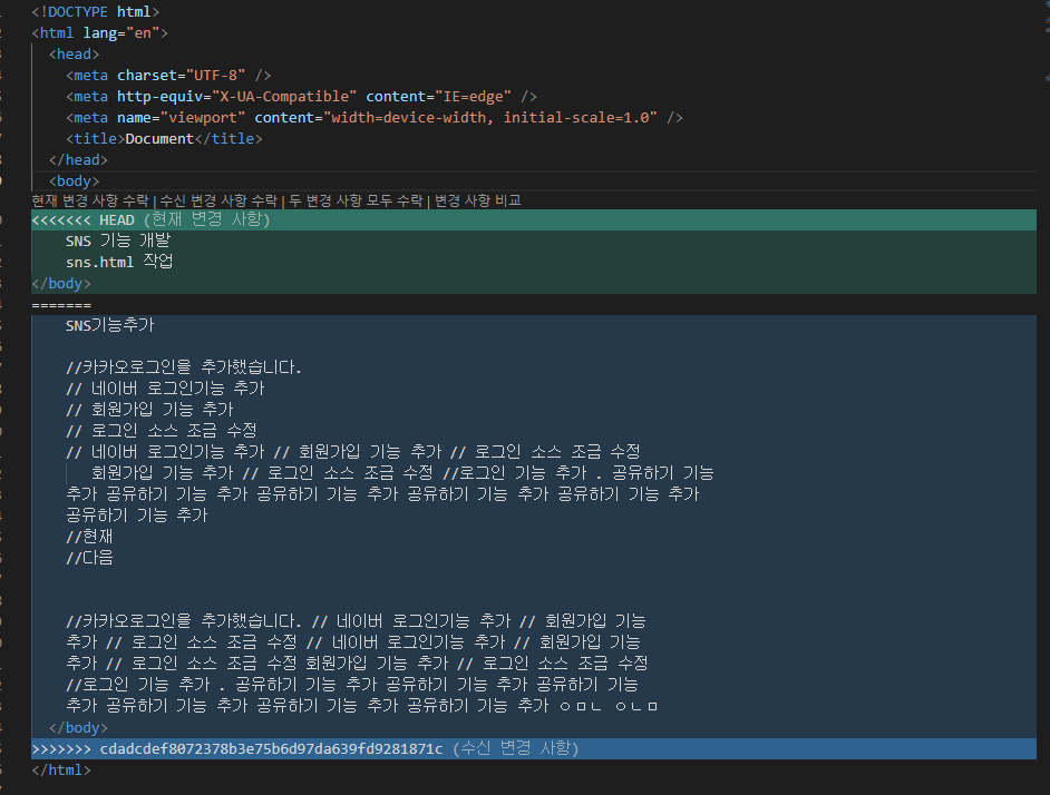 4-2. 충돌 병합이 날 경우 파일에 들어가서 수정할 부분이 있는지 확인한 후 Push를 해준다.