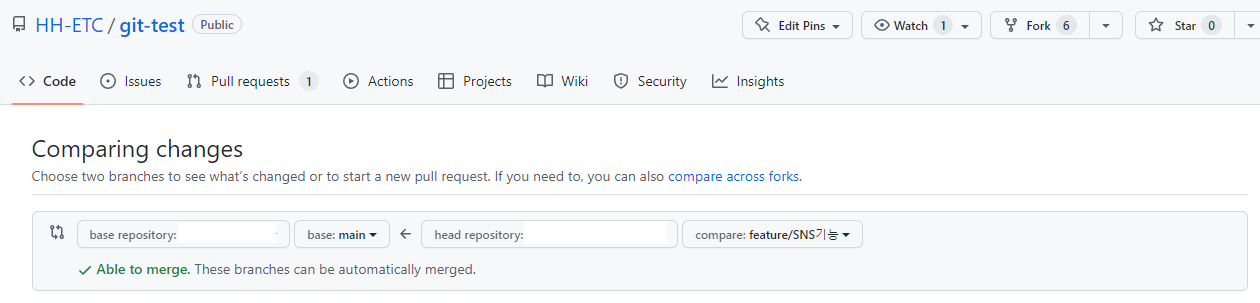 화살표로 가르키는 곳이 Origin Repository 반대쪽이 Remote Repository이다. PL을 주고받을 Branches를 확인해주고 밑에 Able to merge. 인지 확인 후 Create 를 눌러주면 된다.