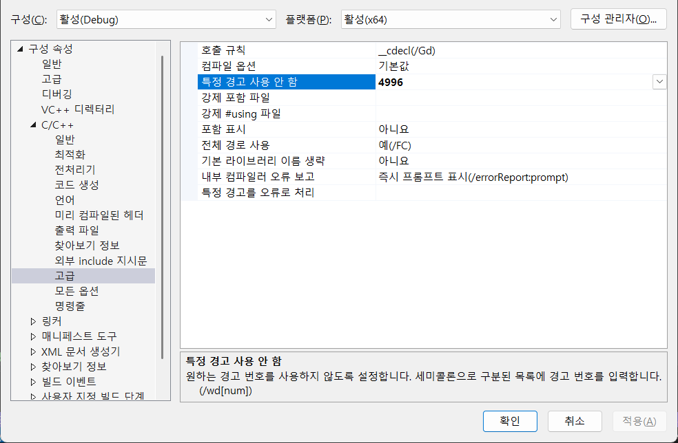 의 [구성 속성]>[C/C++]>[고급]>[특정 경고 사용 안 함]
