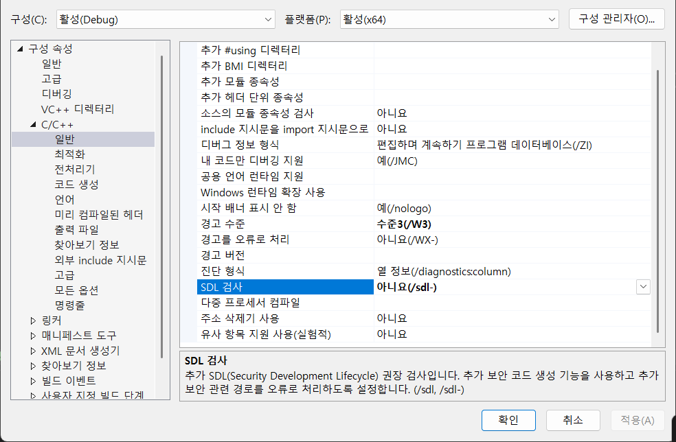 의 [구성 속성]>[C/C++]>[일반]>[SDL 검사]