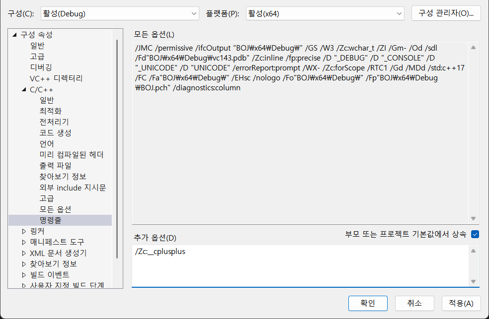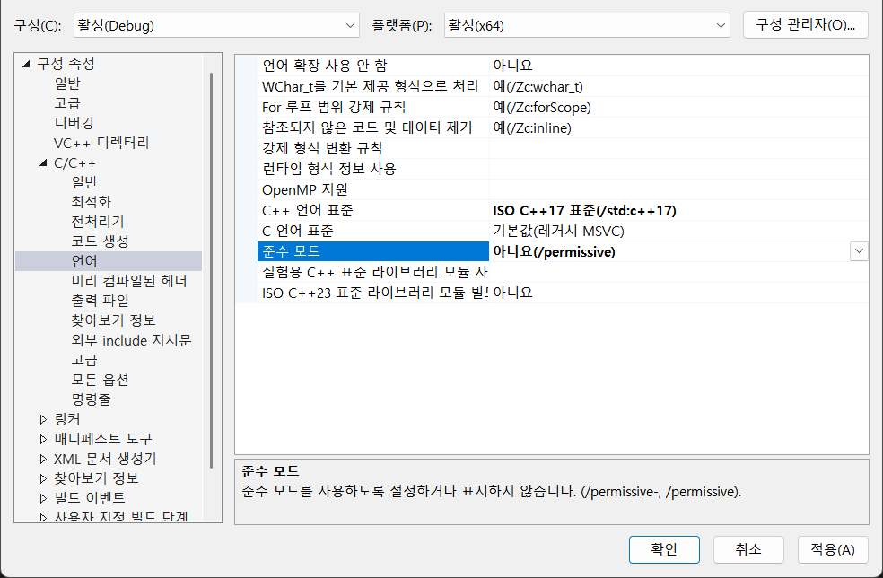 의 [구성 속성]>[C/C++]>[언어]>[준수 모드]
