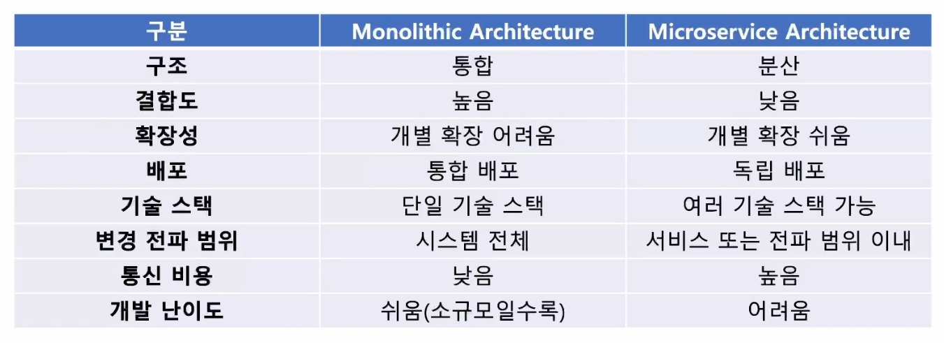 다음과 같이 표를 만들어 Monolithic Architecture 와 Microservice Architecture의 장단점을 표로 정리하였다.