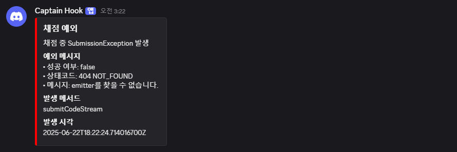 형태로 발송되며, 예외 메시지, 메서드명, 발생 시각 등의 정보를 함께 담아 문제 추적에 활용할 수 있다.Slack등의 대안도 존재하지만, 현재 팀 상황이나 채점 시스템 담당인 내 입장에서는 Discord 채널이 가장 빠르고 즉각적인 커뮤니케이션 수단이었기 때문에 선택했다.