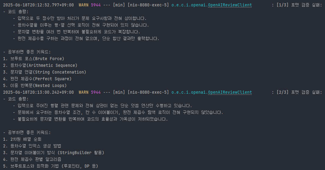 코드 리뷰나 채점 요청은 외부 서버(OpenAI, 채점 서버 등)와의 통신을 기반으로 작동하기 때문에, 네트워크 지연이나 서버 다운과 같은 외부 장애가 발생할 경우 사용자 경험에 영향을 줄 수 있다.